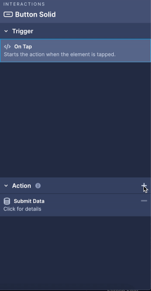 Actions can be assigned to any Button or Touchable in your project. After you select a Button or Touchable in the Layer Tree, go to the Interactions tab of the Properties Panel and click the '+' next to the 'Action' header to open the menu of Actions to choose from.