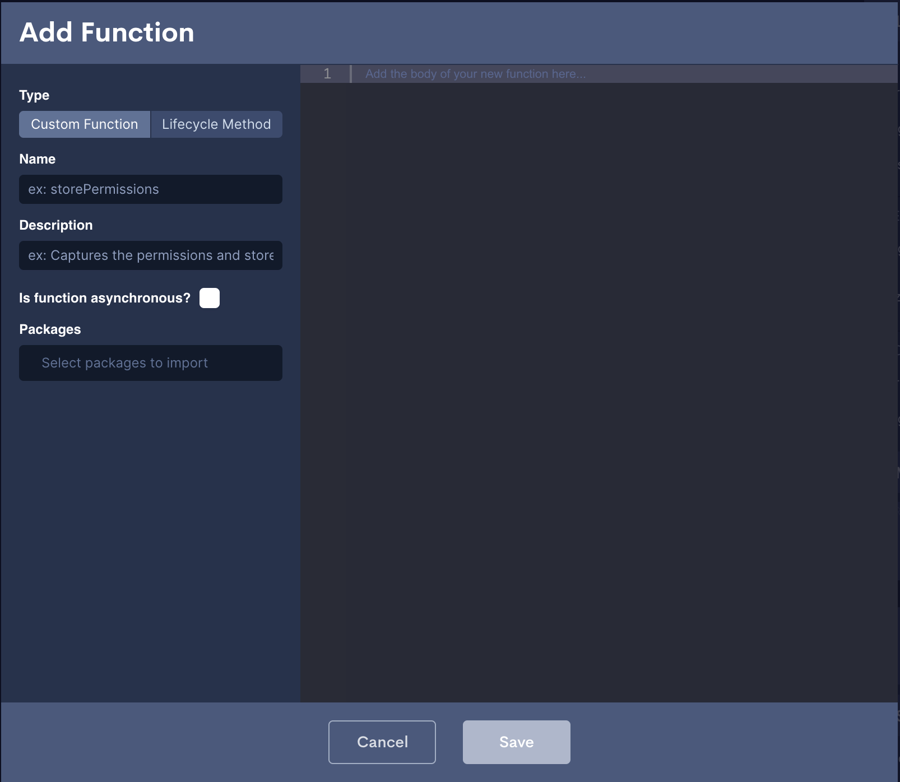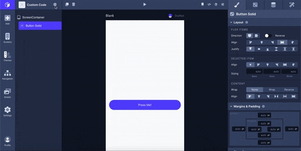 The Custom Screen Code feature allows you to store functions on a screen-by-screen basis. To access this feature, click Screen Settings (the gear icon on the right of the name of your App) and then click Custom Code in the left sidebar.