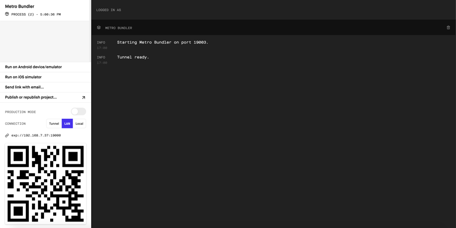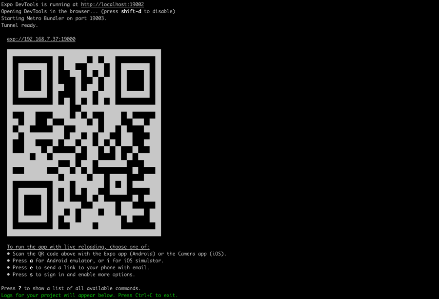 In the terminal, navigate into the project directory and run yarn install or npm install to install all the necessary dependencies. Then, run expo start. A new tab will open in your browser that will give you a QR code to scan to view your project on your phone. Additionally, you can click Run on Android device/emulator or Run on iOS simulator and Expo will start the project in Android Studio or XCode if they are installed on your computer.