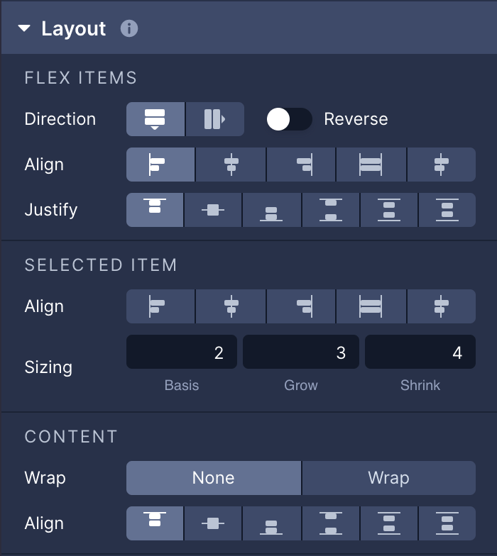Setting the Flex Direction establishes the main axis and direction that child elements are placed along in the layout.