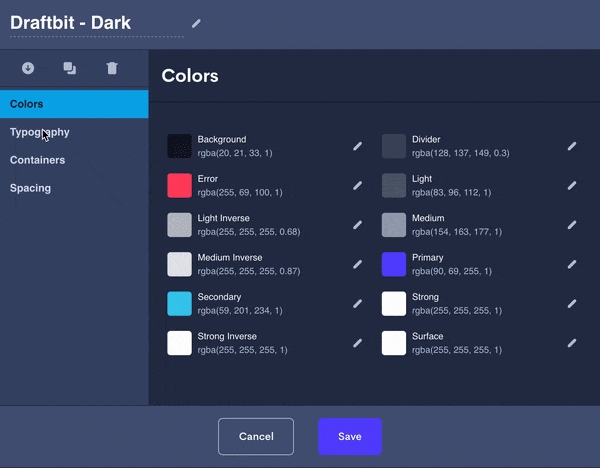 In this tab, you are able to configure the Elevation that can be applied to Cards or Containers. Here you are able to customize the color, size, opacity, and position of the drop shadow across 4 different Elevation settings.