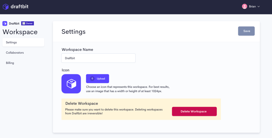 Change the Workspace Name and Icon on this page. Additionally, you can permanently delete the entire workspace. After clicking Delete Workspace, you will be asked to confirm its deletion.